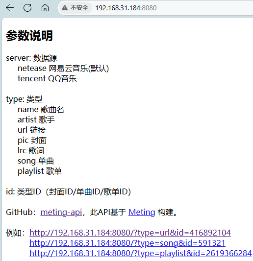 meting-api 是一个基于 创建的 APlayer API 项目,提供音乐相关的 API 服务,可用于获取音乐的各种信息,如歌曲详情、歌词、封面图片、播放链接等,也能获取歌单信息。、